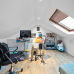 A bright lounge with a feature AGA wood burner, perfect for cosy winter evenings, is the hub of the house and this leads through to a modern fitted kitchen overlooking the back garden with built in appliances and ample eye and floor level cupboards. A short set of stairs lead down to a very substantial rear garden, laid to lawn with a garden shed. A small patio area is a real sun trap and is accessible immediately from the back door. Upstairs, there are two spacious double bedrooms, one to the front and one to the rear, alongside a modern bathroom with an electric shower fitted over the bath. Accessed from a cupboard in the front bedroom, a set of fixed stairs lead to a floored attic space with a Velux window and plenty of storage, which is currently used as a home office. The property benefits from gas central heating and is fully double glazed throughout.